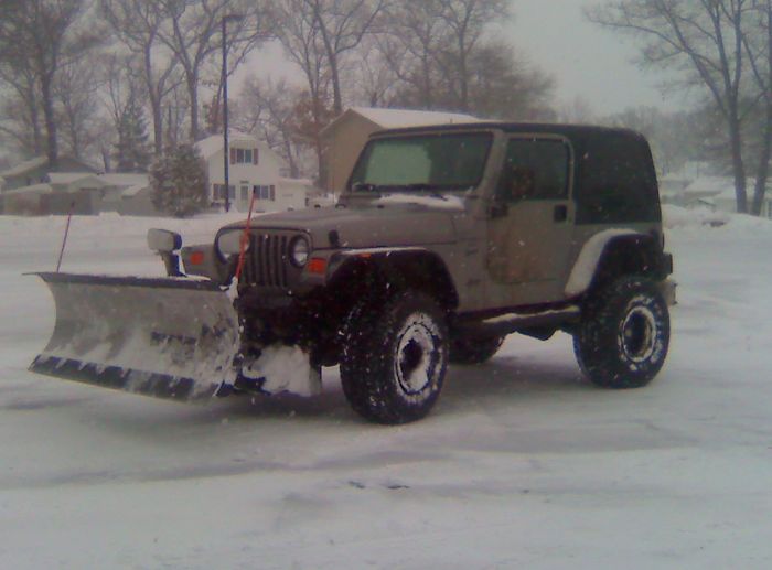 driveways and make a little extra cash, as many places pay for the cleaning of the parking lots and their subdivisions. Now I’ve heard some negative comments from some people, who thought Jeeps were too light for this kind of job, or that they some folks had to do a major over-haul of the front suspension, due to the use of the snow plow. My experience and that of the people I know, tells a different story. Jeeps manoeuvrability is unparalleled for this kind of job and as long as you avoid hitting hard the frozen snow banks, you will not bend or break anything. I actually know people who have a total of 26,000 documented plow miles.